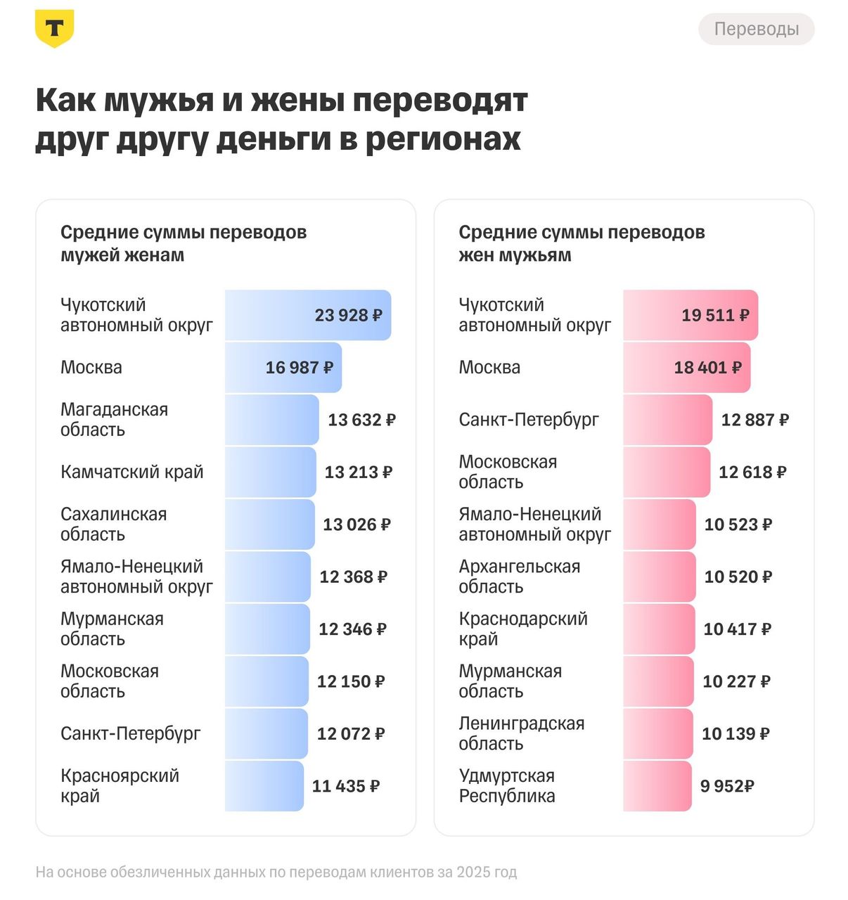 Среди всех регионов больше всего денег мужья и жены переводят друг другу в Чукотском автономном округе — почти в 2 раза выше средних сумм по России: средняя сумма перевода от мужа жене — 23 928 ₽, от жены мужу — 19 511 ₽. На втором месте Москва: от мужа жене — 16 987 ₽, от жены мужу — 18 401 ₽. По переводам мужей тройку замыкает Магаданская область (13 632 ₽), а по суммам от жен — Санкт-Петербург (12 887 ₽).