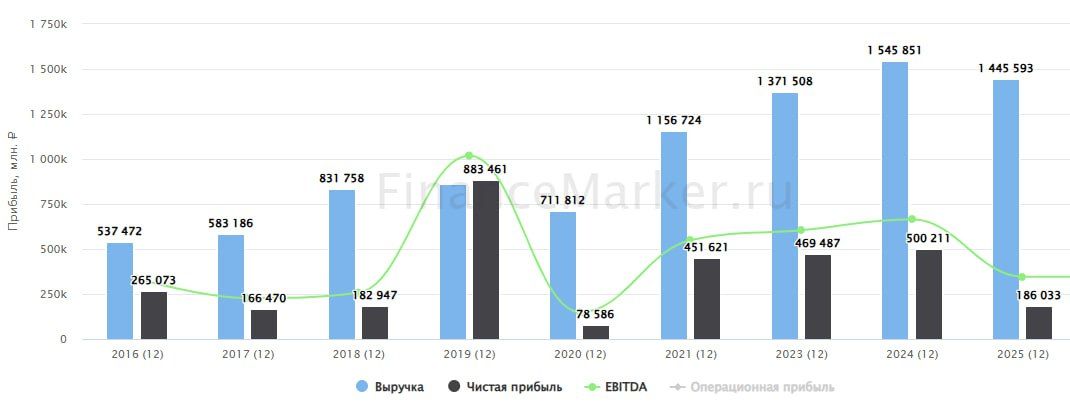 Выручка в 2025 году снизилась на 6,5% по понятным причинам (падение цен на нефть, санкции), EBITDA на 15%. Прибыль, очищенная от разовых бумажных факторов, сократилась в 2,7 раза до 206,5 млрд руб. Что именно стало главной причиной - остается только догадываться, глядя на строку "прочие расходы".