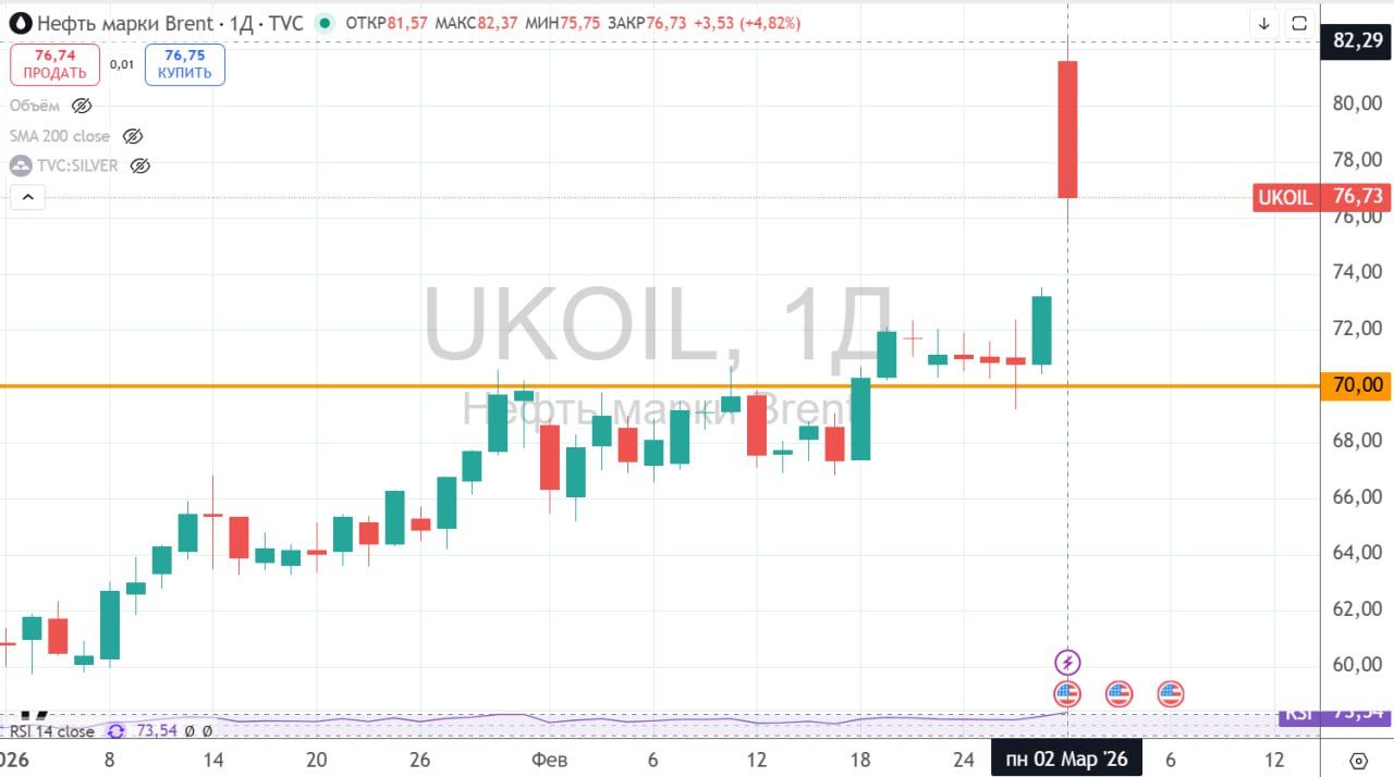 Главное, за чем сейчас следят все инвесторы и спекулянты - Ормузский пролив, который контролируется Ираном, через него перевозится до 30% всей мировой нефти. Официальных уведомлений о перекрытии пролива не было, но заявления просачивались в СМИ. На фоне этого, цена на нефть марки BRENT в пике пробивала отметку 80 долларов за баррель. Только 2 марта цена ходила в диапазоне с 73 до 83 долларов.