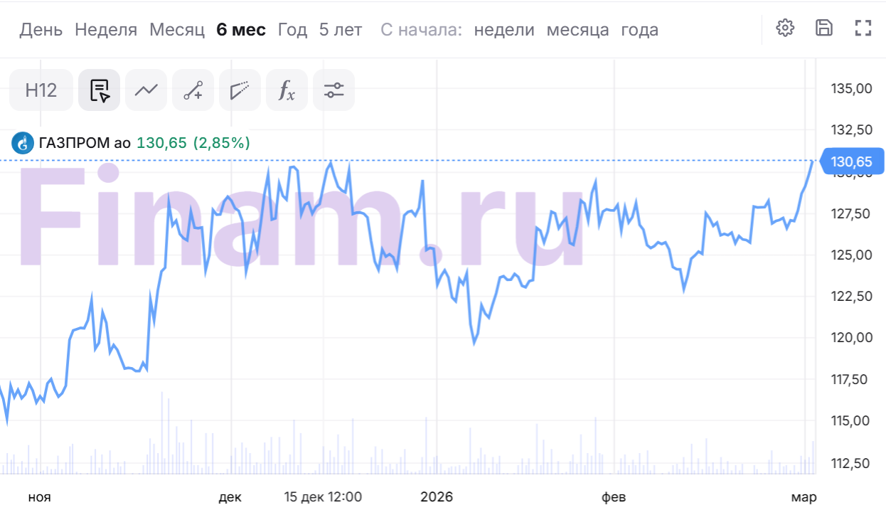 Сегодня, 2 марта, акции «Газпрома» достигли максимальных с декабря 2025 года значений. Обострение ситуации на Ближнем Востоке спровоцировало рост цен на нефть и газ.
