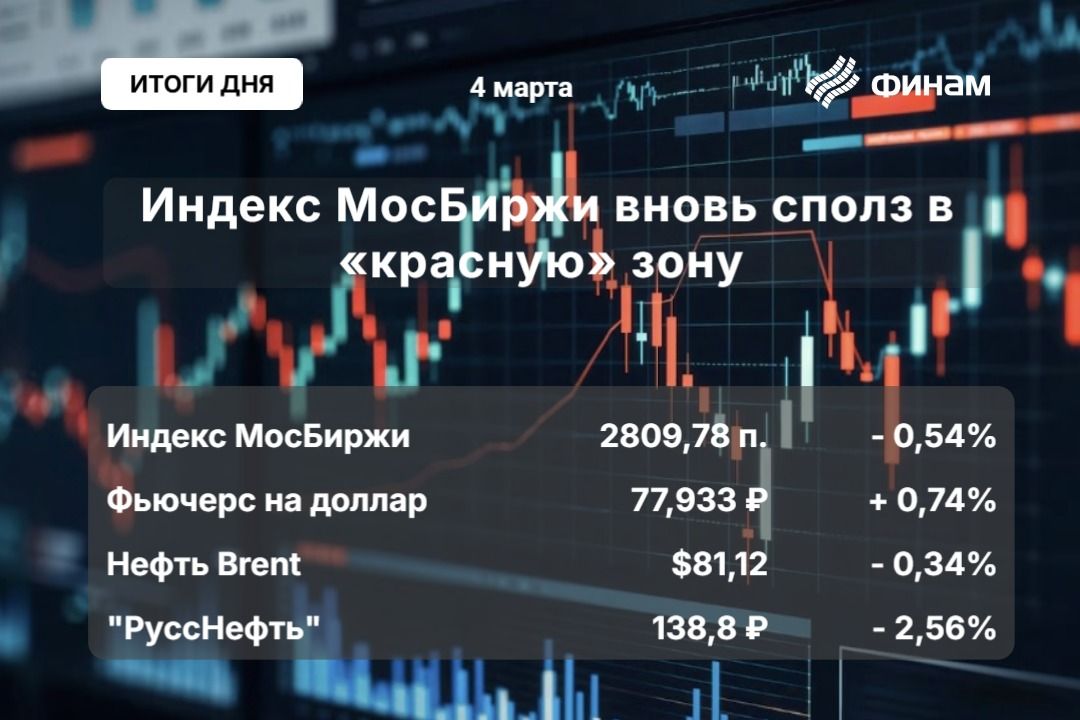 В среду, 4 марта, основная сессия на российском фондовом рынке завершилась в «красной» зоне. Начав день с роста, индексу МосБиржи не удалось сохранить свои позиции, и во главе с нефтяниками индикатор отступил на 0,54%, до 2809,78 пункта. Индекс РТС при этом ушел в минус на 0,79%, до 1137,7 пункта.