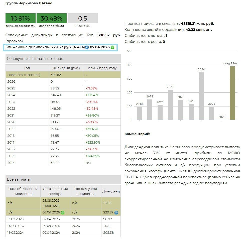 Дивидендная политика: Дивидендная политика Черкизово предусматривает выплату не менее 50% от чистой прибыли по МСФО ,скорректированной на изменение справедливой стоимости биологических активов и с/х продукции, при условии сохранения коэффициента Чистый долг/скорректированная EBITDA <2,5х в среднесрочной перспективе. Как правило, платят больше 50% (60-70%). Выплата дважды в год по полугодиям.