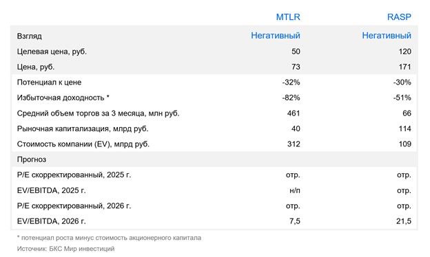 Сохраняем «Негативный» взгляд на «Мечел» и «Распадскую». Акции обеих компании торгуются с отрицательными спотовыми мультипликаторами Цена/Прибыль (Р/Е) из-за убытков на фоне кризиса в металлургической отрасли. С учетов наших прогнозов на 12 месяцев целевой Р/Е на 2026 г. для Мечела и Распадской будет отрицательным. Мы считаем, что главными драйверами роста будут постепенное восстановление цен на угольную продукцию, а для «Мечела» еще и дальнейшее снижения ключевой ставки. У компании крупная долговая нагрузка (соотношение Чистого долга и EBITDA в I полугодии 2025 г составило 8,8х), которая оказывает давление на прибыль через процентные расходы.
