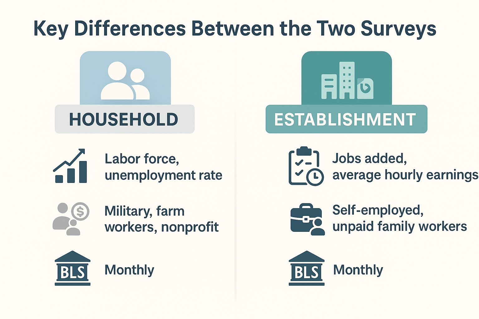 The Employment Situation Summary, published each first Friday, consists of two critical surveys by the BLS: the household survey and the establishment survey.