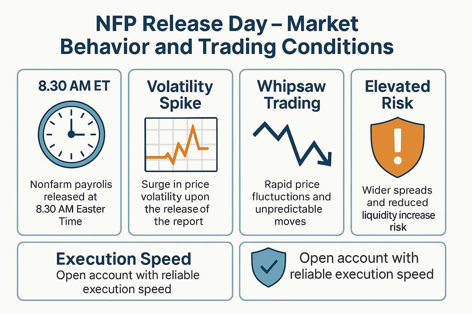 NFP release day, typically the first Friday of each month at 8:30 AM Eastern Time, is a high-stakes event. Markets often enter a "holding pattern" in anticipation, only to react violently at the moment of release.