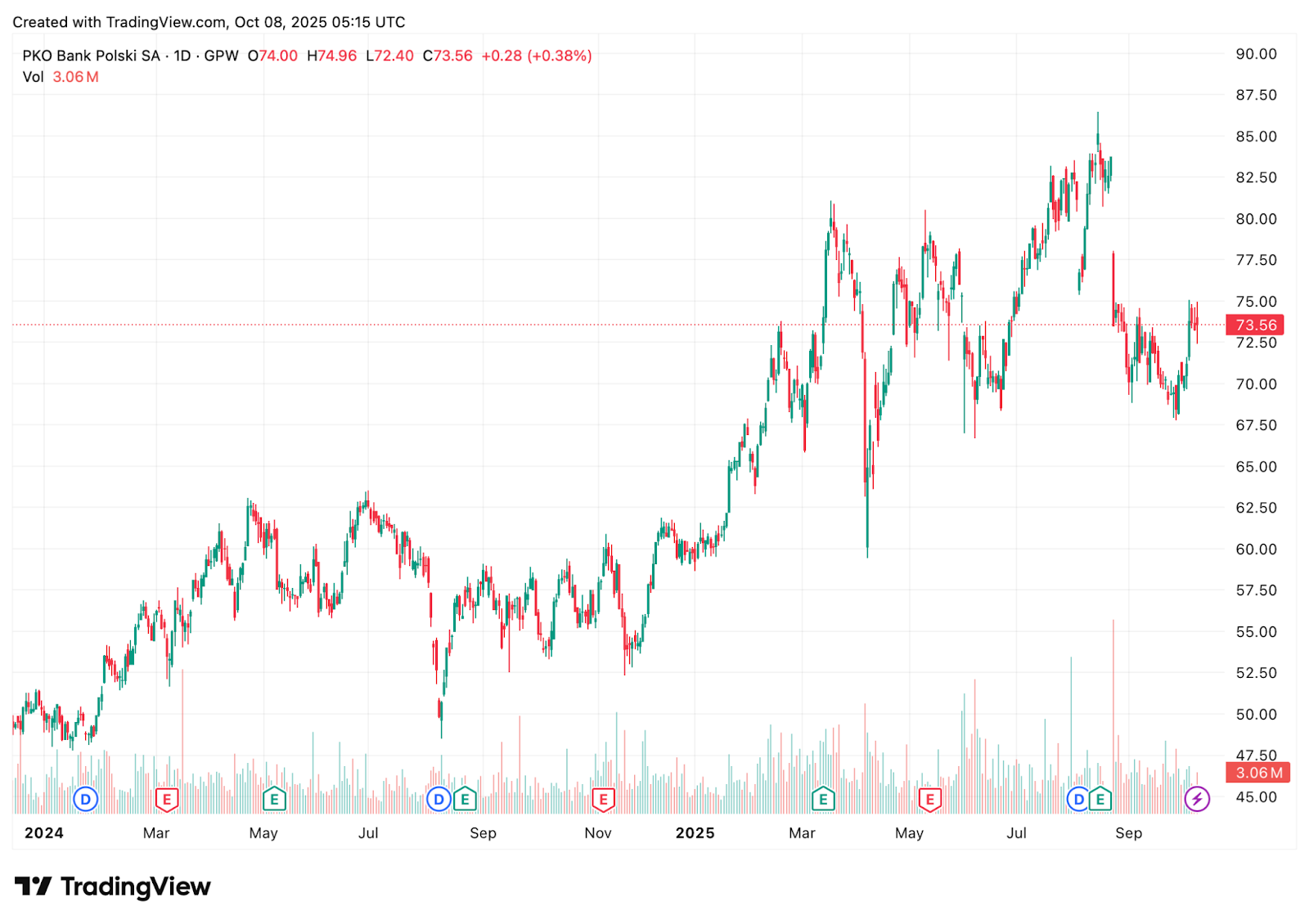 As of October 8, 2025, the share price of Powszechna Kasa Oszczędności Bank Polski SA (PKO BP) stands at approximately PLN 77.5 per share, marking an increase of over 30% compared to the end of 2024. The stock remains near its local highs, with the trend staying stable and supported by the bank’s strong financial results.
