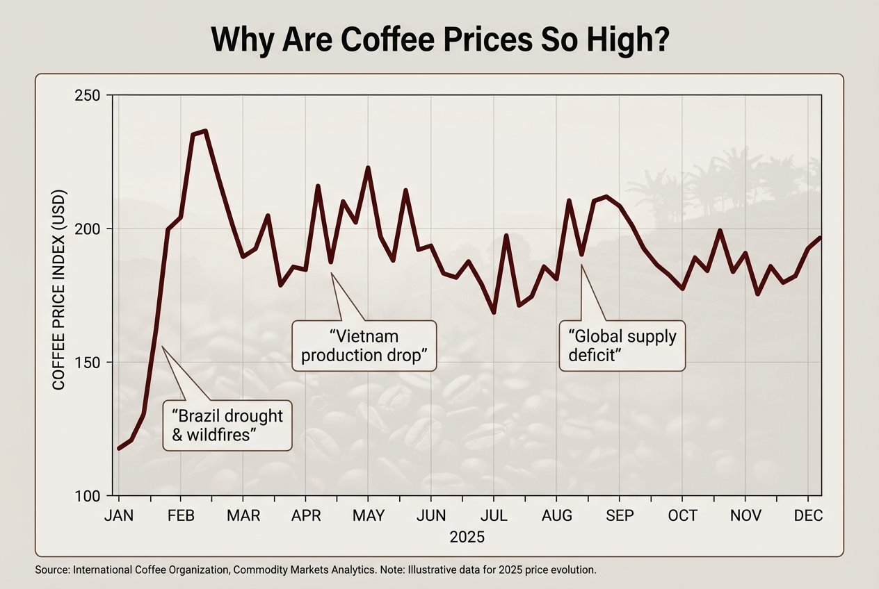 Coffee prices reached unprecedented levels in 2025, with the ICO Composite Indicator Price hitting $3.54 per pound in February—the highest monthly price on record. Climate disruptions in Brazil and Vietnam, supply chain constraints, and tight global inventories drove this surge, fundamentally reshaping market dynamics for buyers and traders.