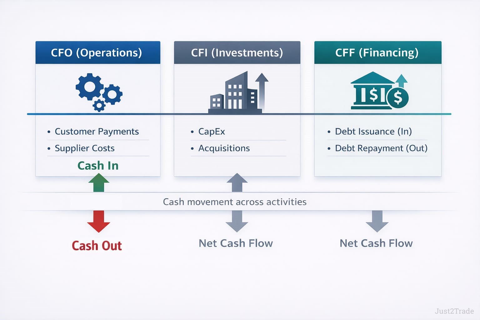 - Financing Cash Flow (CFF) – Cash movements from capital structure activities including debt issuance, equity offerings, and shareholder distributions