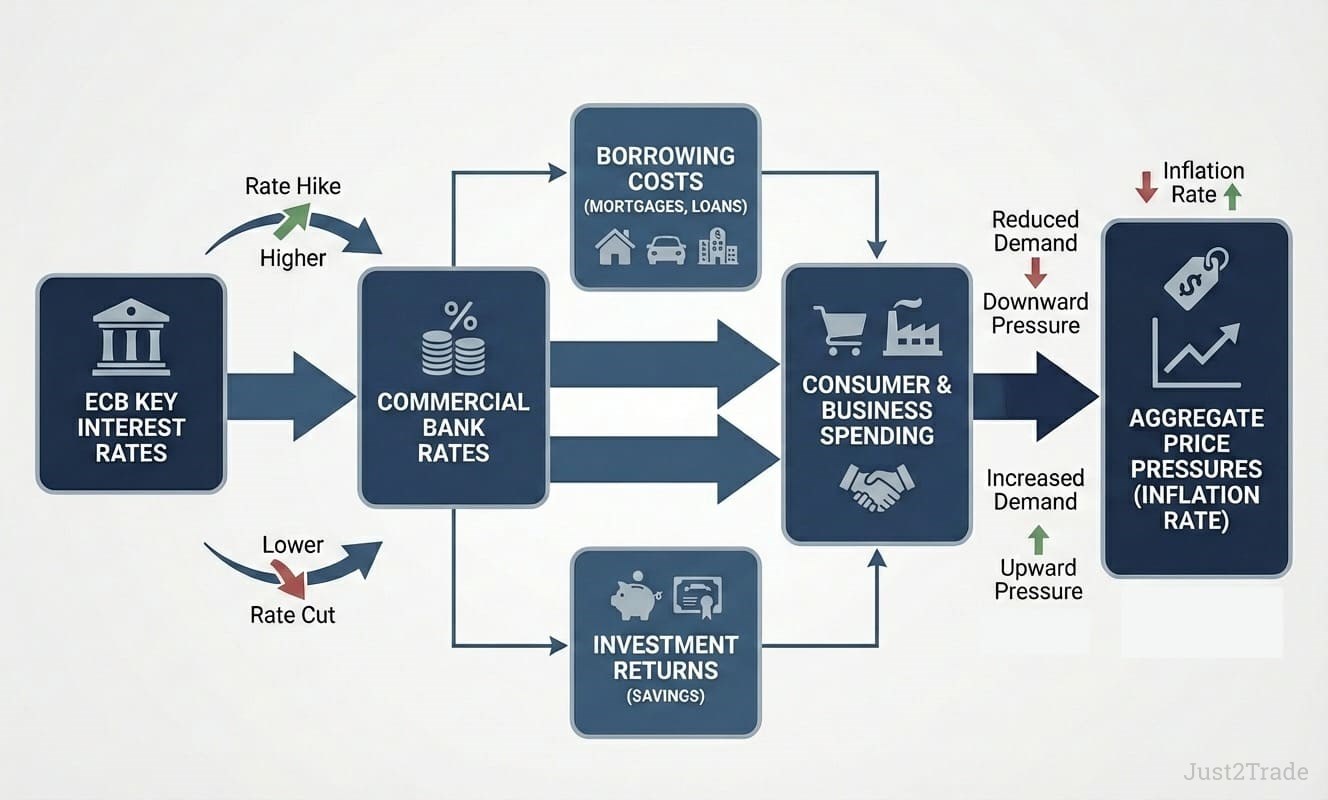 ECB Deposit Rate → Commercial Bank Rates → Consumer & Business Borrowing Costs → Spending & Investment Patterns → Aggregate Price Pressures → Inflation Rate