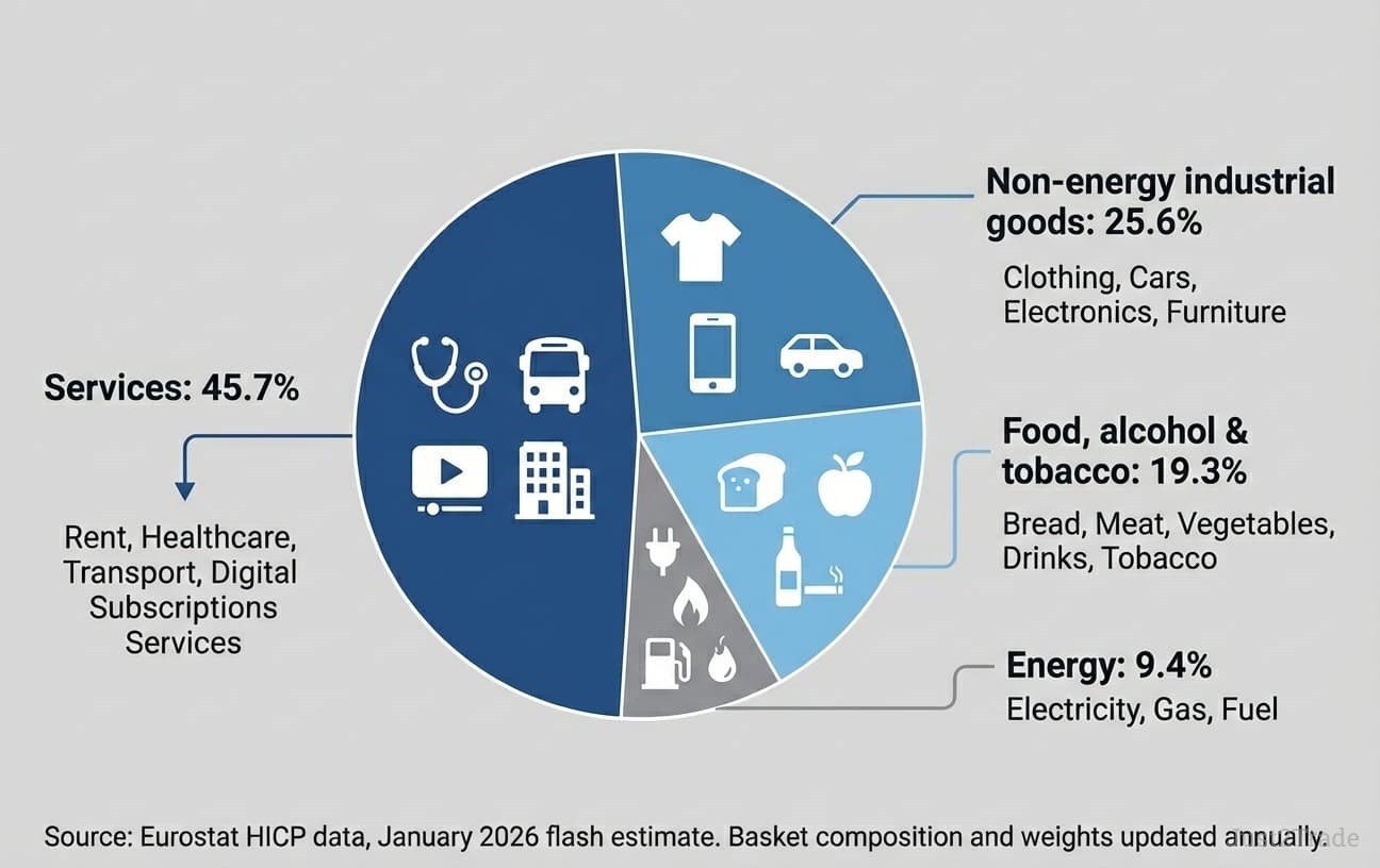 Energy carries a 9.4% weight in the euro area HICP but is far more volatile than other components. In January 2026, energy prices fell 4.1% year-on-year, dragging headline inflation well below the ECB's target. When energy prices spiked in 2022, they were the dominant force pushing inflation above 10%.
