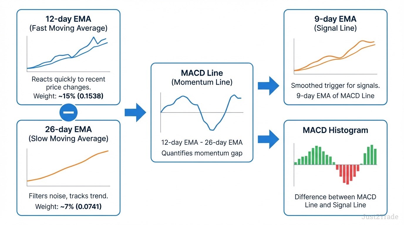 This period sensitivity difference between the 12-day and 26-day exponential moving averages creates the MACD's analytical power. The faster 12-day EMA reacts quickly to price movements, capturing short-term momentum shifts. The slower 26-day EMA filters out noise while tracking the underlying trend. When you subtract the slower EMA from the faster EMA, the resulting MACD line quantifies the gap between short-term momentum and longer-term trend direction—revealing whether momentum is building with the trend or diverging from it.