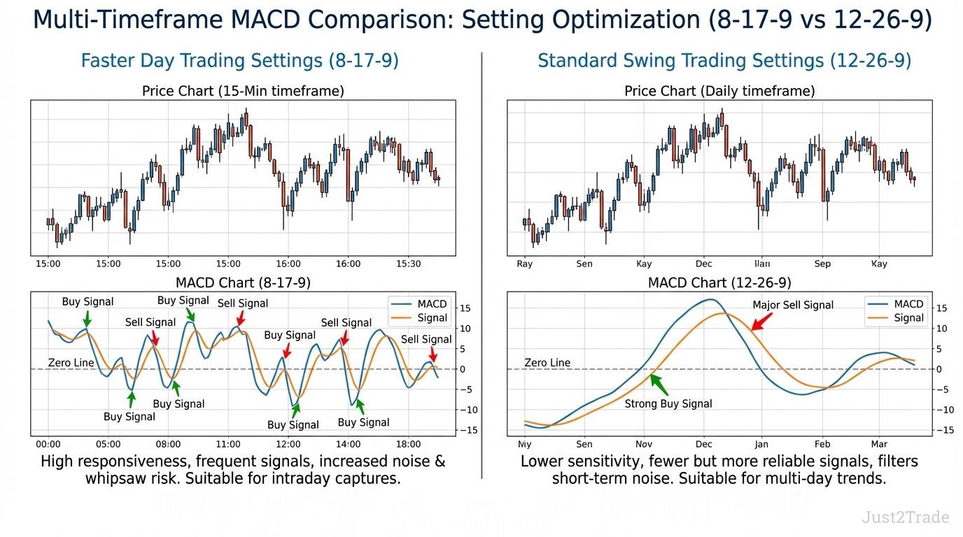 These accelerated parameters increase signal frequency but also raise false signal risk. Day traders using faster MACD settings must employ strict confirmation requirements and tight risk management to compensate for increased whipsaw potential during ranging market conditions.