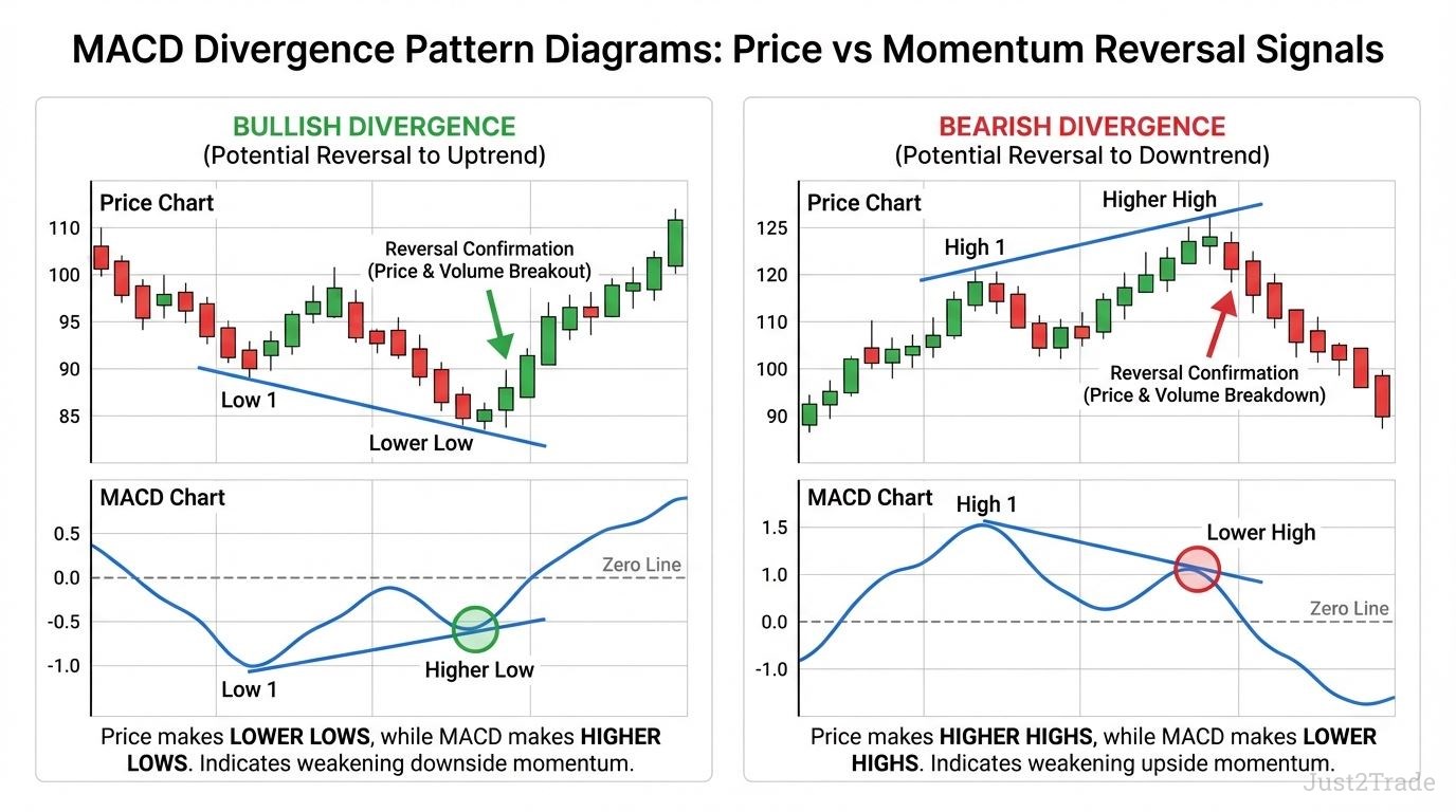 MACD divergence represents one of the most powerful reversal patterns in technical analysis. Divergence trading occurs when price action and the MACD indicator move in opposite directions, signaling potential momentum exhaustion and impending trend reversals.